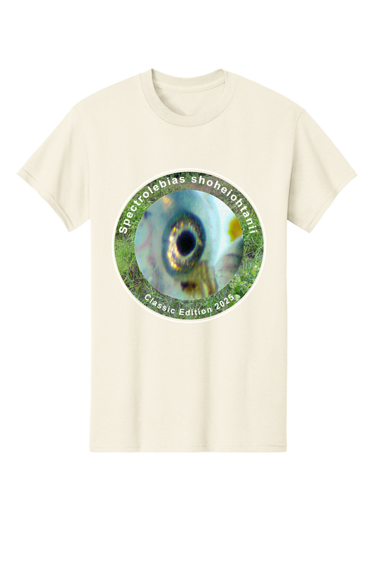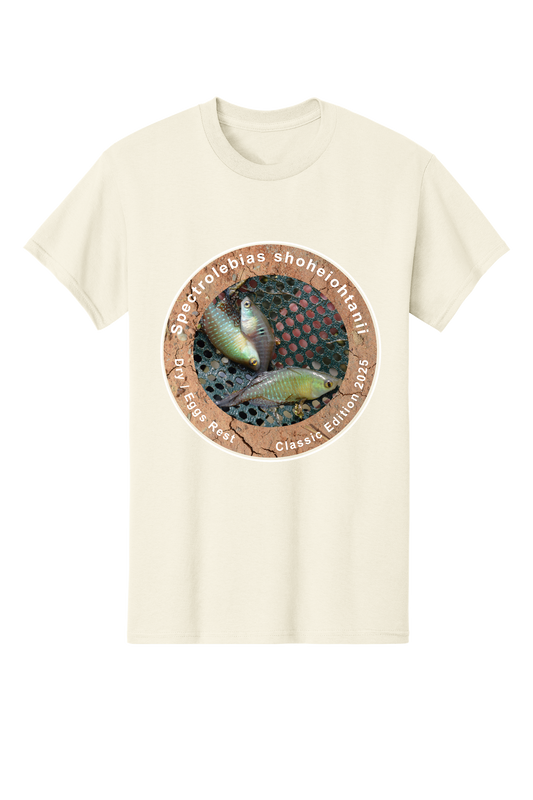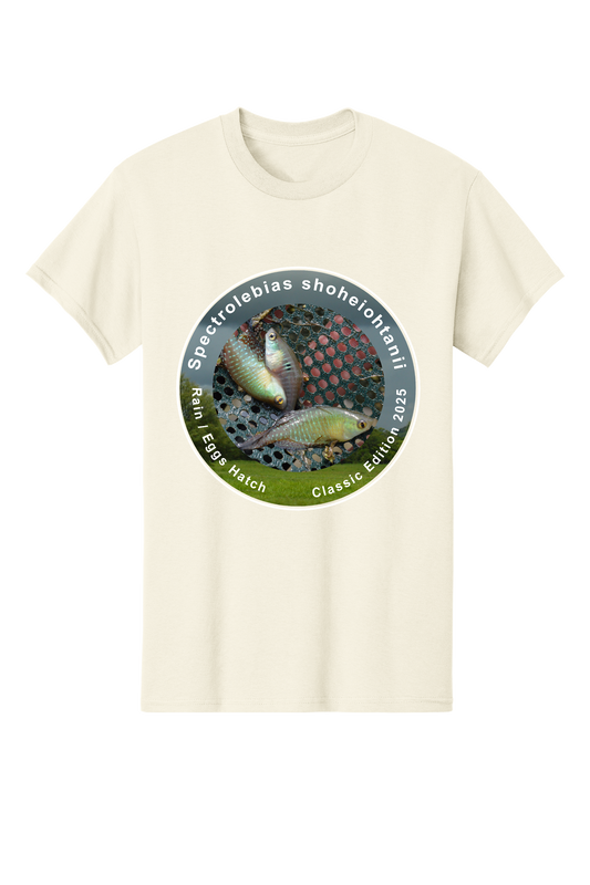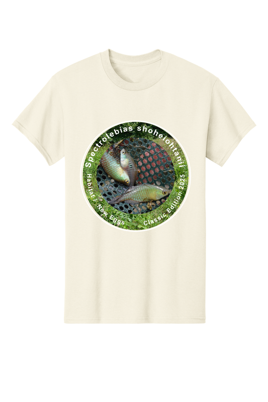 パトプリント 大谷翔平選手にちなんで名付けられた魚、スペクトロレビアス ショヘイオタニイを様々なデザインでプリントした大人向けのクラシックTシャツです。