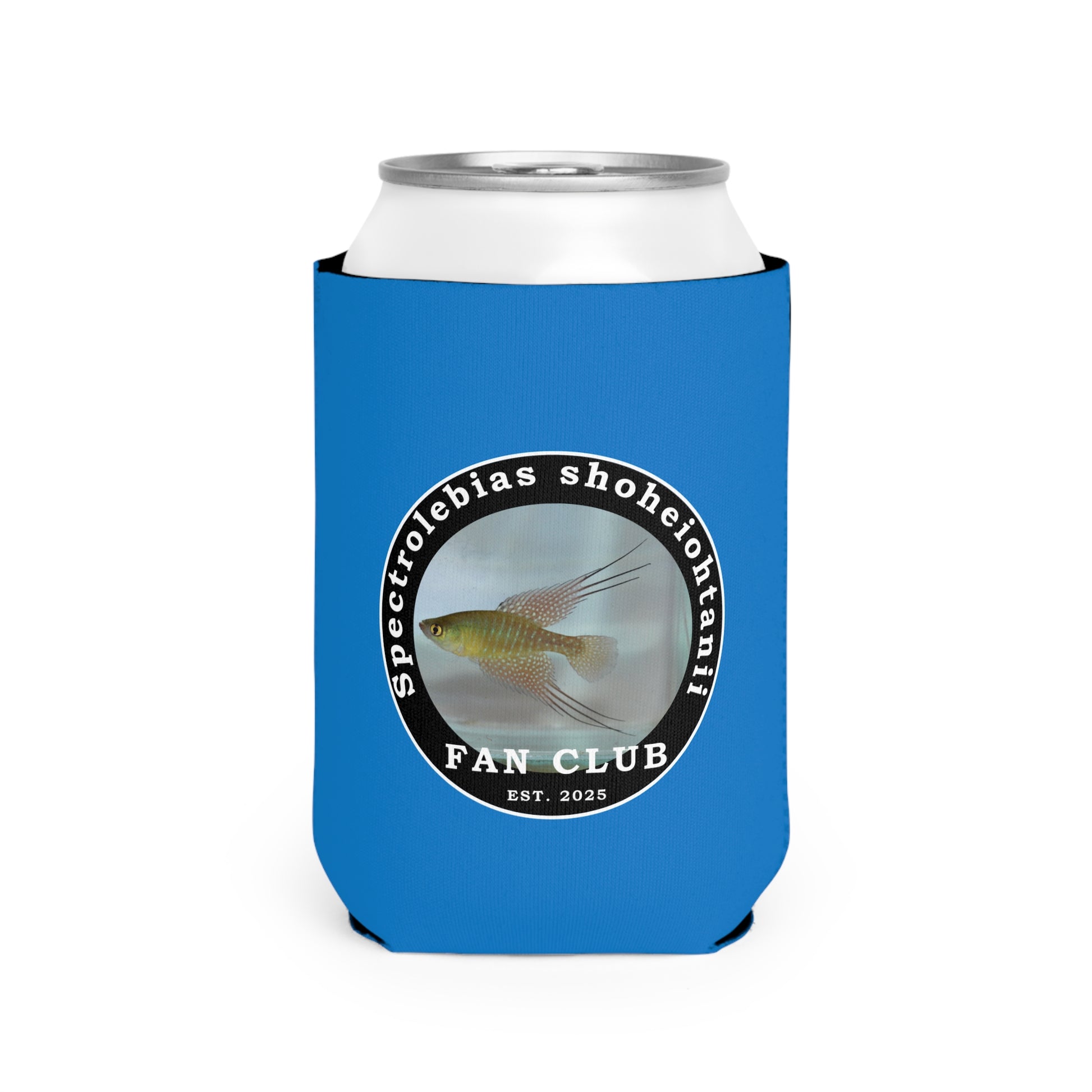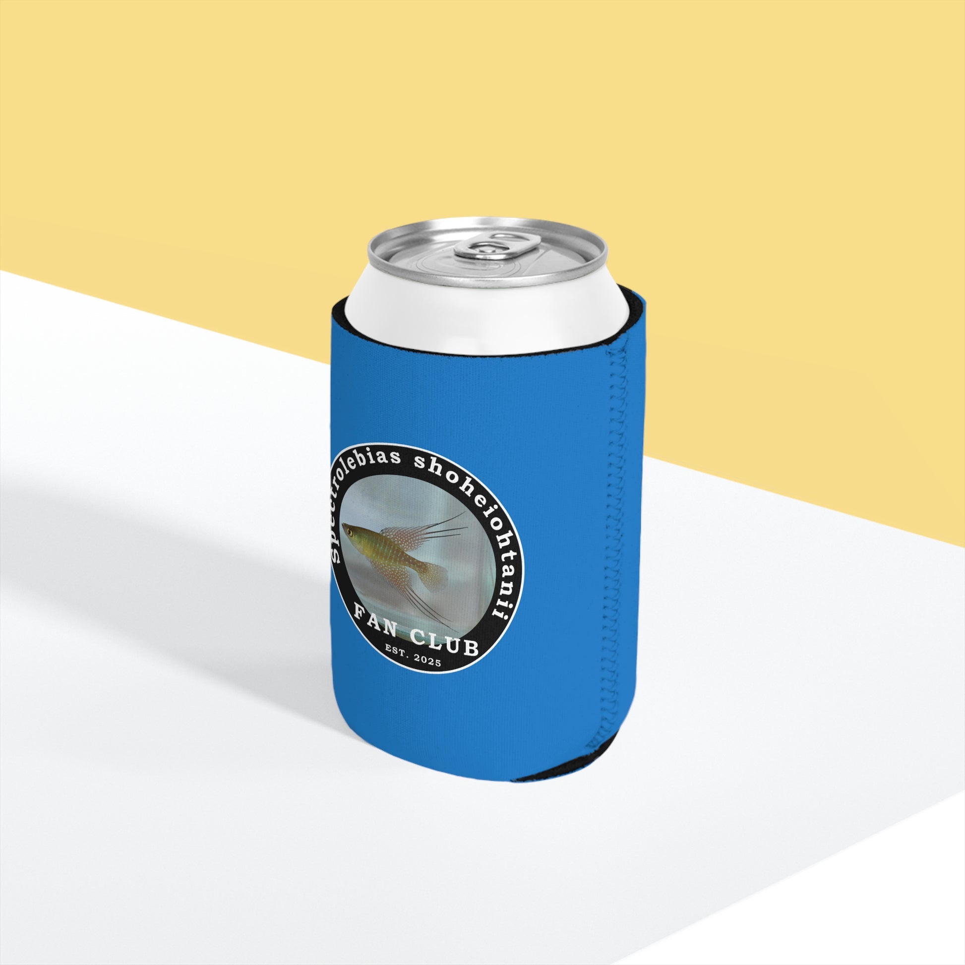 鮮やかなブルーのネオプレン製缶クーラースリーブに、円形の「Spectrolebias shoheiotanii Fan Club」バッジとソフトフォーカスのメダカの絵があしらわれています。軽量で折りたたみ式で、標準的な12オンス缶にかぶせてぴったりとフィットし、滑りにくいので保冷効果も抜群です。鮮やかな昇華プリントが魚とバッジを鮮明に再現し、内側のブラックと同色の糸がクリーンで洗練された印象を与えます。プリントの工程上、小さな縫い目が見える場合がありますが、これは手作りならではの魅力であり、このユニークなデザインを際立たせています。